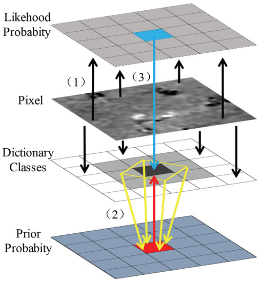 Figure 2 shows the block diagram of Bayes. Each pixel in the image corresponds to four values, and an image can be thought of as four layers, including likelihood probability, gray scale, dictionary classes, and priori probability. Assuming that the class of the surrounding pixel is known, our objective is to get the class label of the central pixel. Step (1) in Figure 2 obtains the likelihood probability of the center pixel. In Step (2), the prior probability of the central pixel is modeled according to the distribution of the surrounding pixel. In Step (3), the posterior probability and the likelihood probability are both considered to determine the label of the central pixel.