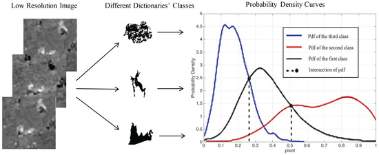 In order to reconstruct the Landsat difference image with dictionaries of different classes, the input MODIS image must be classified given its difference value. Let represent the world state of the label image C and the MODIS difference image V. To get the label image C given its value V, the following Bayes formula is used: