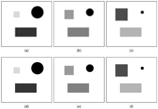 Simulated images: (a) MODIS-like image at ; (b) MODIS-like at ; (c) MODIS-like at ; (d) Landsat-like at ; (e) Landsat-like at ; and (f) Landsat-like at .