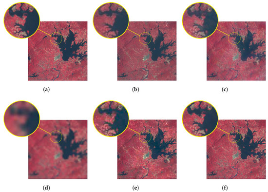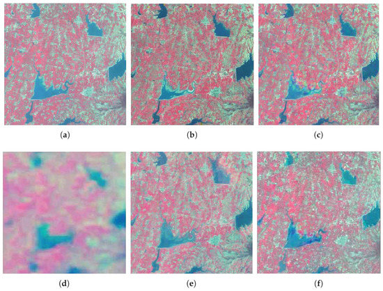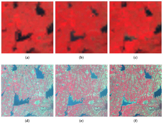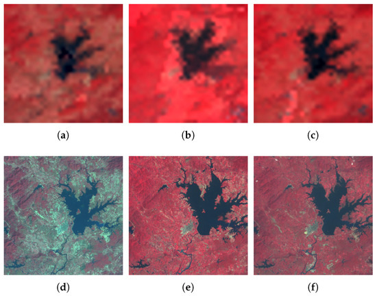 Figure 8a–c are the low-resolution images, Figure 8d–f are the known high-resolution images, and Figure 8e is the true image of the high-resolution image that will be reconstructed. Given that these images are obtained in the same month in different years, the overall value of the image slightly changes because the vegetation remains almost the same for all seasons and the climate is similar. As shown in Figure 8a–c, as the years pass the lakes shrink obviously. In the Landsat images, the edge shape and shrinking traces of the lakes are clear. In the MODIS images, the shape of the lake is not depicted in detail; therefore, we fuse the existing image to reconstruct high-resolution images at the middle moment.