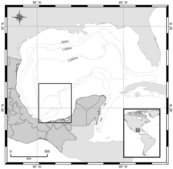 Gulf of Mexico highlighting the Campeche Bay region. The rectangle illustrates the region from which most oil slicks (98%) have been observed [9,10]. Isobaths of 200 m, 1000 m, and 3000 m are also shown. Courtesy of Adriano Vasconcelos.