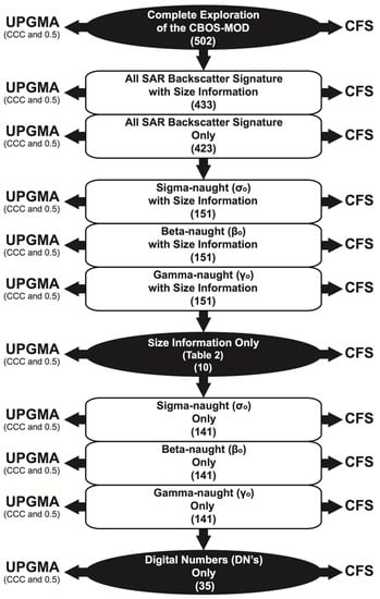 A summary of the analyzed 11 original sets, as well as the 33 optimal subsets of selected variables, i.e., UPGMA (CCC and 0.5) and CFS, is presented in Figure 2. These are collectively referred to as 44 data sub-divisions. It is expected that these particularly fruitful attribute-wise evaluations reveal hidden complexities into information capable of distinguishing the oil slick type.