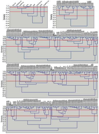 - Farris, J.S. On the cophenetic correlation coefficient. Syst. Biol. 1969, 18, 279–285. [Google Scholar] [CrossRef]