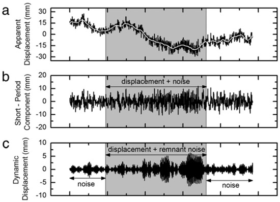 (a) Apparent displacement and smoothed displacement; (b) Short-term apparent vertical displacement component showing noisy oscillation signal; and (c) Dynamic displacement with remnant noise computed from the time series [3].