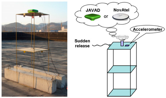 The applications of high rate sampling frequencies (>25 Hz) for the deformation of structures was presented and evaluated by Yi et al. [29]. Yi et al. [29] presented large number of experiments to test high-rate GPS receivers performance (50 and 100 Hz) in terms of their accuracy, limitations, and potential use for structures’ health monitoring. They used high-rate carrier phase GPS receivers to investigate bridges’ deformation. The receivers adopted in their study included the NovAtel ProPak-V3 that is capable of sampling data up to 50 Hz, and JAVAD TRIUMPH-1, which is capable of gathering data up to 100 Hz (the highest sampling frequency in the market). Static experiments are conducted in order to investigate the frequencies and amplitudes of the receivers’ noise, as well as the potential applications of such high-frequency data rate. Kinematic experiments are performed in a controlled steel frame model and comparisons are made with a Lance LC0161A accelerometer (Figure 3). A monitoring experiment on a real large-scale bridge (Dalian BeiDa Bridge) is presented in their study. Some results and preliminary conclusions are presented as follows [29]: