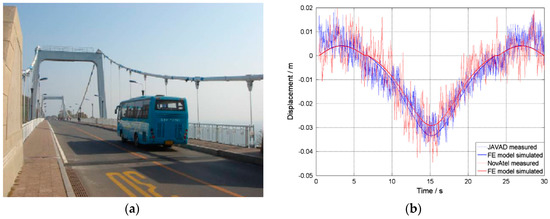 Figure 4. (a) Heavy bus passing and (b) bridge observation response and simulation due to the passing bus [29].