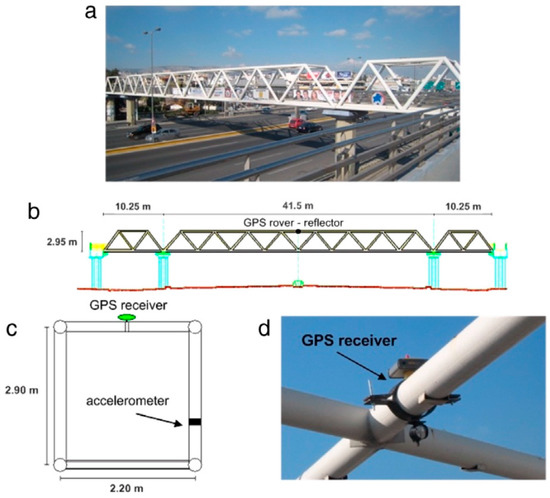 (a) View of the stiff, steel pedestrian bridge; (b–d) Longitudinal and cross sections of the bridge and location of the sensors used to measure the bridge deflections [3].