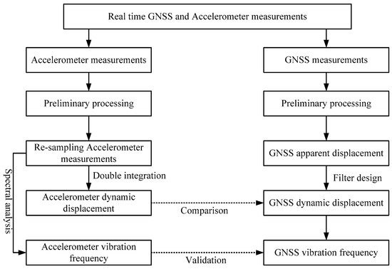 Moreover, Moschas and Stiros [16] utilized an ultra-high-rate (100 Hz) GNSS to evaluate stiff bridge behavior, and they used the process evaluation, as shown in Figure 6, to estimate the monitoring system accuracy. They reported that the results can push the limits of the application of GNSS in structural-health monitoring and identification to stiff structures, and it can be used to estimate the damping ratio up to 3.22 [16]. Finally, Yu et al. [59] introduced a dynamic network-based real-time kinematic (NRTK) GNSS monitoring system of bridges. The main advantage of the NRTK monitoring system is its low cost. While the correction base depends on the available global network for the country; therefore, the designed system used one receiver to collect the structure’s data and solved it using a DGPS system [59]. The results of this study showed that the NRTK-GNSS can be used to detect the bridges dynamic behavior [59]. Also, the results show that the NRTK-GNSS accuracy is good enough for monitoring purposes, with peak differences less than 2 mm, SD less than 1.8 mm, and correlation coefficients higher than 93.4% between the NRTK and accelerometer displacements [59]. The proposed NRTK-GNSS technique accuracy is higher than the conventional RTK-GNSS technique, although the latter has many successful applications of bridges and tall buildings dynamic monitoring [59].