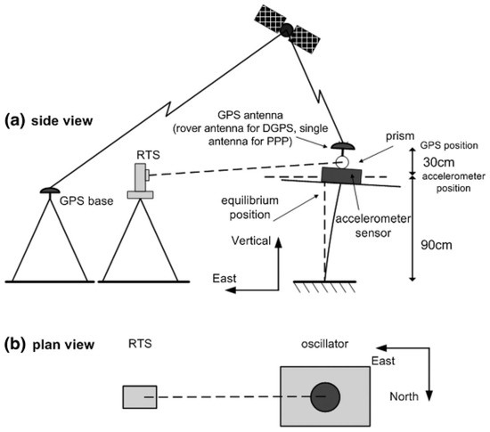 Moschas et al. [23] presented the experimental assessment of the PPP dynamic measurements of seismic motion as follows: They produced a sequence of semi-static displacements followed by free oscillations, and these motions were recorded by GPS, as well as by an accelerometer and a robotic total station (RTS) (Figure 7). The collected data permit to compute apparent displacements in three axes, but the main focus of the study was the horizontal (axial) oscillation along a vertical plane defined by the base of the oscillator and the RTS. This leads to no lack of generality, for in most regions the GPS accuracy is similar in northing and easting; hence, the analyzed experiments are representative of any horizontal earthquake-induced movement. GPS recordings were analyzed using different PPP software packages and DGPS. The PPP time series apparent displacements were then compared with those derived from DGPS and other sensors, where time series of known accuracy are assumed to provide “true” or reference values. The quality and limitations of the DGPS technique and adopted RTS outputs have been documented in experiments and studies of monitored structures (e.g., see [24,29]).