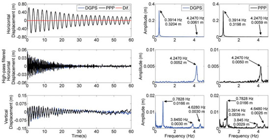 As presented in Figure 8, the PPP results are very close to the DGPS extraction dynamic behavior. Therefore, it is concluded that the PPP can be used with real monitoring of structures and can decrease the cost of the GPS-SHM monitoring systems.
