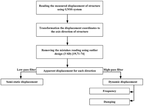 When studying structures’ movements, structures’ dynamic behavior (damping and frequency) should be investigated. Limited studies, currently, investigated the dynamic behaviors of structures based on GPS monitoring techniques [16,19,74]. Moreover, denoising the GPS signals is an important process to evaluate structures’ dynamic behavior. Recent studies stated that GPS noises and errors can be eliminated using wavelet analysis [10,15,27]. Figure 9 illustrates the GPS measurements process to estimate the behavior of structures. Many types of filters are used to decrease the noise effects and estimate the accurate behavior of structures. The low-pass filter was utilized to estimate the semi-static behavior, while the band-pass and high-pass filters were applied to extract the dynamic behavior. Kalman filter is a popular filter used to eliminate the GPS noises [75], moreover, a moving average filter is a simplified filter to extract the semi-static movement of structures [3]. Also, an adaptive filter is applied alone or integrated with Kalman filter to denoise the GPS measurements for structures [76]. Additionally, a high-pass and a low-pass Type I Chebyshev filter are used to estimate the behavior of structures based on GPS measurements [3,49]. Recently, with the development of GPS sampling frequency, the studies stated that GPS noises and errors can be eliminated using wavelet analysis [10,15,27]. Details of the wavelet analysis process of the GPS can be found in [56,59].
