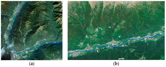 True color composites of (a) WV-3 image of Sarca River and (b) the GeoEye image of Noce River; the river channels are highlighted by blue lines.