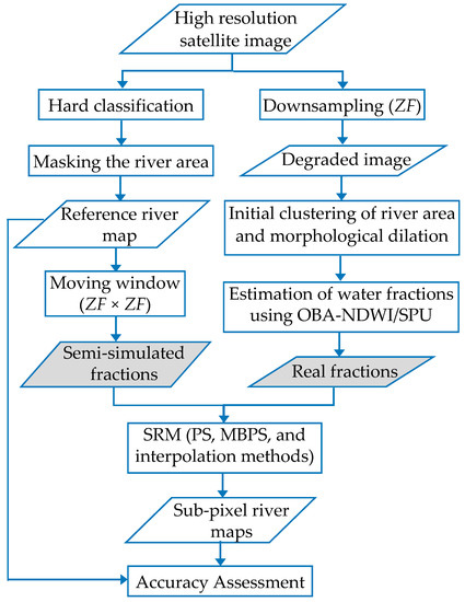 The procedure considered for the mapping and assessment of river boundaries at the sub-pixel resolution using both real and semi-simulated fractions; ZF represents the zoom factor.