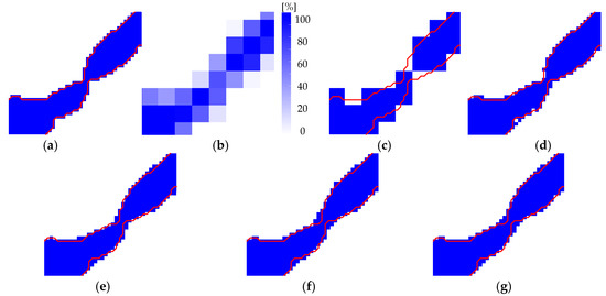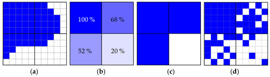 The river area is initially masked out on the high resolution image using a hard classifier to take it as the reference map which has binary water/non-water labels. Then, a moving window with the dimensions equivalent to the user selected zoom factor (ZF) is applied on the reference map. ZF defines the number of sub-pixels that a single pixel can be split in through SRM process. The number of water pixels is counted in each window, which can be simply converted to the fractions in the [0, 1] range. The content of each window (i.e., the number of water pixels) is known from the high-resolution reference map; thereby the fractions can be considered known and with no uncertainty. For instance, semi-simulated fractions are calculated by moving a 5 × 5 window (ZF = 5) on the reference water map in Figure 3. The semi-simulated fractions can provide free-of-error inputs not only for SRM algorithms, but also for hard classifiers. This is because the most abundant class is known within the windows (coarse pixels). Therefore, a water/non-water label can be assigned without the usual uncertainties of hard classifiers concerned with spectral confusions and similarities existing among different land cover classes (Figure 3c). Following the simulation of water fractions, SRM algorithms and conventional hard classification can be applied and compared. A possible random arrangement of sub-pixels for the given example is presented in Figure 3d where the goal of SRM algorithms is to find the proper spatial distribution of sub-pixels.