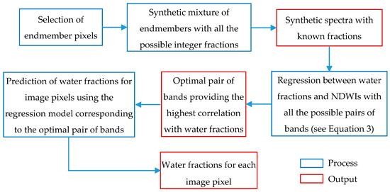 The step-by-step procedure for implementation of the proposed optimal band analysis for the normalized difference water index (OBA-NDWI) for the estimation of water fractions.