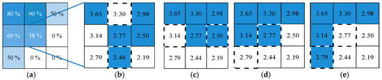 Water fractions and the pixel swapping (PS) process for spatial allocation of sub-pixels for a given pixel; (a) water fractions, (b) random allocation of sub-pixels, and (c,d,e) swaps (candidate sub-pixels for swapping are highlighted by dash-lines). Values of sub-pixels represent their attractiveness toward the water class.