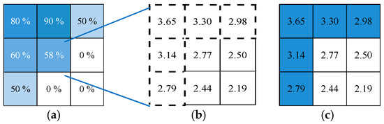 An example of bilinear interpolation of water fractions; (a) water fractions at the pixel level, and (b) interpolated water fractions at the sub-pixel level with ZF = 5.
