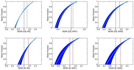 The regressions of normalized difference water index (NDWI) values with different band combinations obtained from synthetic WV-3 spectra against known water fractions; the pair of bands used for calculation of NDWI is indicated on each graph (CB and RE stand for coastal-blue and red-edge bands, respectively); zero-threshold and Otsu’s threshold are illustrated respectively with blue (dashed) and red (dot-dashed) lines.
