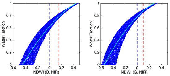 Toward estimation of real water fractions using the proposed method relying on OBA-NDWI, training samples for the three desired classes (i.e., water, vegetation, and soil) are selected from the imagery. The spectra of the endmembers are estimated based on the average values of the samples which are selected from different spots distributed along the rivers. For each endmember, about 30 pixels are selected by visual interpretation. Then the linear mixture is performed to synthetize all the possible fractions concerned with the three endmembers. NDWIs with all the possible combinations of spectral bands are applied on the synthetically mixed WV-3 and GeoEye spectra; the outputs are plotted against the known values of water fractions (some examples are shown in Figure 9 and Figure 10). The regression model providing the highest correlation is then used to predict the water fractions of all image pixels. In addition, zero-thresholds and Otsu’s thresholds are applied on NDWI values to assess these two conventional threshold methods for hard delineation of water bodies.