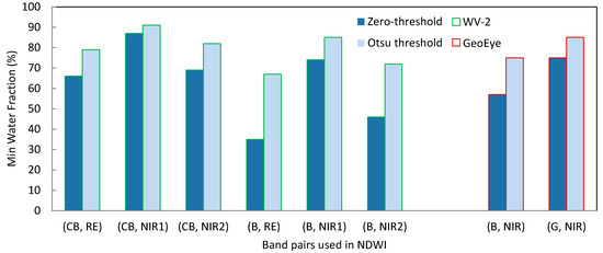 Minimum water fractions corresponding to zero-threshold and Otsu’s threshold for several NDWIs using synthetic WV-3 and GeoEye spectra; CB and RE stand, respectively, for coastal-blue and red-edge bands.