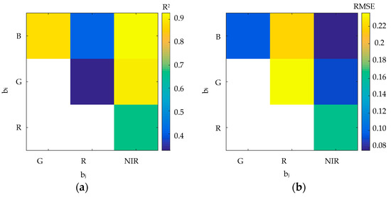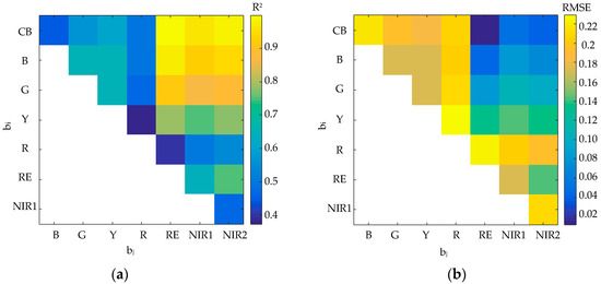 OBA-NDWI for the synthetic WV-3 spectra; all possible combinations of spectral bands are considered in the structure of NDWI to perform a second-order regression against water fractions. Values of (a) R2 and (b) RMSE are represented by color bars.