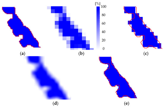 Interpolation-based SRM using semi-simulated water fractions: (a) reference map, (b) semi-simulated water fractions (ZF = 5), (c) hard classifed map, (d) bicubic interpolation of water fractions, and (e) sub-pixel map; reference river boundaries are represented by red lines on each map.