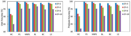 User and producer accuracies of the sub-pixel river maps resultant from the SRM of real fractions associated with the SPU and the OBA-NDWI algorithms are illustrated, respectively, in Figure 22 and Figure 23 for Sarca and Noce rivers, respectively. Obviously, the accuracies of sub-pixel maps are decreased in the presence of uncertainties related to unmixing. However, the sub-pixel maps are accurate up to 90% with ZF ≤ 5. The accuracies of sub-pixel maps associated with water fractions derived from the proposed OBA-NDWI are comparable with those obtained from the SPU. This is while the proposed method is simpler and easy to be numerically implemented and applied for water mapping issues.