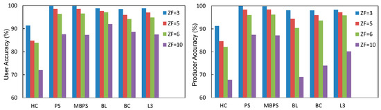 The user/producer accuracies of hard classification are remarkably lower than that of sub-pixel maps. For instance, the error maps of hard classification and a sub-pixel map of the same area are represented in Figure 19, which shows that the hard classified map encompasses a large number of misclassified pixels. This issue gets worse with higher ZF where the difference between the accuracies of hard classification and SRM methods reaches above 10%. Interpolation-based SRM and MBPS lead to comparable accuracies with respect to the PS algorithm except at higher zoom factors (ZF = 10) where the producer accuracies of interpolation-based techniques are lower.
