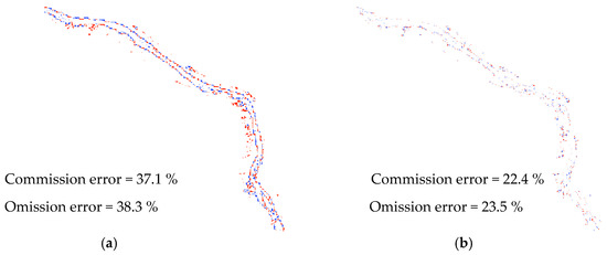 Error maps of (a) hard classification and (b) sub-pixel map obtained from MBPS for a segment of the Sarca River using the WV-3 image with ZF = 6; red and blue pixels show erroneously committed and omitted water pixels, respectively.