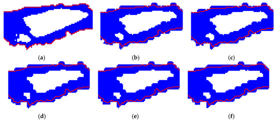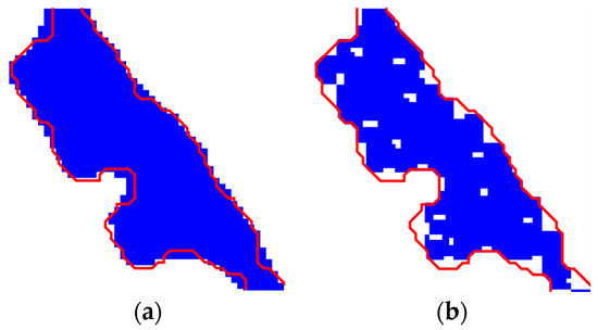 The real water fractions obtained from the SPU algorithm, as well as those obtained from the proposed OBA-NDWI, are used as inputs for SRM algorithms. This provides the possibility of investigating the effect of uncertainties associated with water fractions on the final sub-pixel maps. Figure 20 illustrates the sub-pixel maps based on water fractions derived from the OBA-NDWI method. In Figure 21, outputs of the PS/MBPS algorithms are selected from parts of maps where some isolated groups of sub-pixels exist inside the river channel, which is due to errors of estimated water fractions. However, applying a majority filter on the resultant sub-pixel maps can reduce this drawback in order to produce homogenous maps (Figure 21e). These gaps, caused by the underestimation of water fractions by unmixing methods, either the OBA-NDWI or the SPU, are not obviously apparent on the maps of interpolation-based SRM methods due to interpolated values of fractions. Note that the maps are selected randomly from spatially distributed regions along the river channel.