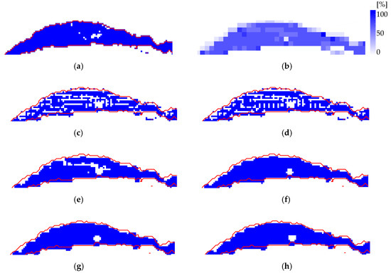 Sub-pixel maps obtained from real water fractions based on OBA-NDWI algorithm for Noce River: (a) reference map, (b) real water fractions based on OBA-NDWI algorithm; sub-pixel maps of (c) PS, (d) MBPS, (e) majority filter applied on MBPS, (f) bilinear, (g) bicubic, and (h) lanczos3 algorithms, ZF = 5.