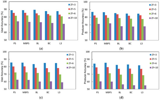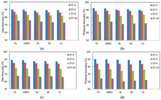 User and producer accuracies of SRM algorithms using real water fractions of: (a,b) the SPU algorthom, and (c,d) the OBA-NDWI algorithm across a range of ZF for Sarca River; (PS: pixel swapping, MBPS: modified binary PS, BL: bilinear, BC: bicubic, L3: lanczos3).