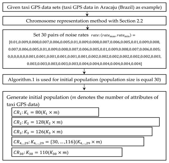 | Function: KMeanPlus (data, solution, dimension)//K-means++ [25] is employed to handle objective function value of noise, select initial seeds, and control the decreasing-rate Input: //give a group of the maximum and minimum noise rates (e.g., 30 pairs of noise rates), they are usually equal to population size. NIND//population size (for example NIND = 30). total_noise_ele_num//give the total number of noised elementary, it is usually equal the number of iterations which is used to noising operation. noise_ele_num//give the number of noised elementary, it is usually equal to population size, or set number of noised elementary. NS//it is the size of the neighborhood. data//input taxi GPS data sets Output: initial population Procedure: FOR 1 to NIND draw the initial current solution s randomly (s, chrom_s(K)) ← Call KMeanPlus (data, s, m)//calculate objective function of noise, and initial seeds, chrom_s denotes seeds of chromosome using K-means ++. best_sol ← s//it is the best solution found since the beginning best_sol(K) ← s//obtain number of clusters each chromosome best_chrom_sol ← chrom_s(K)//produce a chromosome to put into population //denote the value by which rate decrease. //gives the frequency of the restart of the current solution //give the current value of the noise rate //count the number of noise trial which have been applied. WHILE + 1 IF ←rate END solution s translate into binary bits and produce next solution s’//let s’ be the next neighbor of s solution s’ translate into decimal value K and determine K range between 2 and //produce the number of clusters let noise be a random real number uniformly drawn into search s’//search one of its neighbors IF s’ = ∅ Call KMeanPlus (data, s’, m) best_sol ← s’ ELSE perform solution for taxi GPS data sets to start producing chromosome END IF s ← s’ is controlled to produce chromosome END IF //mod is modulo //apply noise rate (=0) descent from s result in a good neighboring solution may be rejected END IF ← s s ← best_sol(K) best_chrom_sol ← chrom_s(K) END IF s ← best_sol(K) ← s END IF IF rate = rate − decrease ELSE rate = r_rate − decrease END END END produce a chromosome and record length of its (the number of clusters) END achieve population (30 chromosomes) initialization |