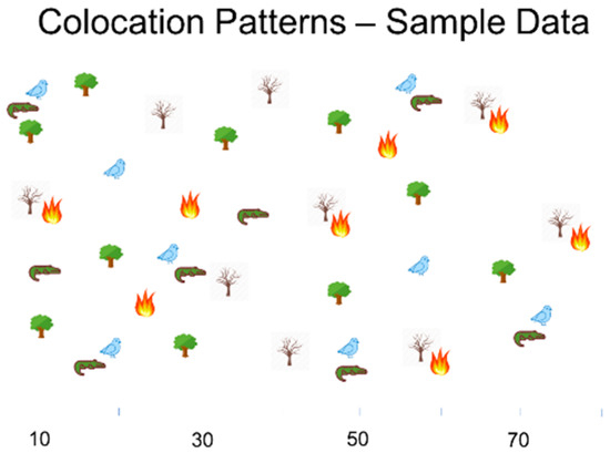 Geospatial colocation patterns represent spatial features (e.g., geo-located objects or events) whose instances are often located together in a geographic neighborhood; such patterns are common in various domains and attract considerable research interest [32]. Colocation patterns often reflect symbiotic relationships, such as that between the Nile Crocodile and Egyptian Plover [33], which often reside in close proximity. Other biological dependencies (e.g., different types of blackberry canes) also have characteristics of colocation [34]. In climate change studies, colocation patterns between global plant growth and climate variables (e.g., precipitation) have also been found [35].