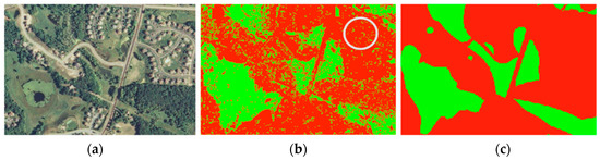 Spatial Classification Problem [6]. (a) input high-resolution aerial imagery, Chanhassen, Minnesota, USA; (b) decision tree prediction with salt-and-pepper errors highlighted in white circle; (c) ground truth class map: red is dry land and green is wetland.