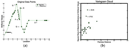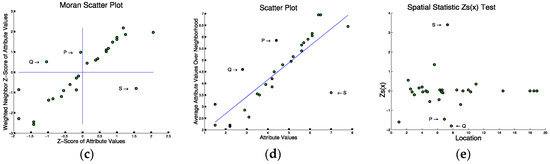 Statistical tests for spatial outliers fall into two categories: graphical tests (e.g. variogram clouds [64] and Moran scatterplots [65]) and quantitative tests (e.g. scatter plots [66] and neighborhood spatial statistics [62]). Graphical tests identify outliers by observing the visual pattern derived. Outliers usually stay either relatively far from the other points or inside specific regions such as certain quadrants. Figure 5 illustrates different testing methods for the 1-D input data in Figure 5a. The variogram cloud shown in Figure 5b finds two pairs of points (Q,S) and (P,S) that are apart from the cluster of remaining points, each pair representing spatially close points with significantly different non-spatial attribute values. The same points are detected by the Moran Scatter plot as shown in Figure 5c where the points in the upper-left and lower-right quadrants indicate points that are significant from their spatial neighbors. Quantitative tests identify outliers by measuring the difference between the investigated points’ non-spatial attributes and their spatial neighbors. Outliers are identified when the difference is larger than a threshold. In Figure 5d, the same points are detected far from the regression line by the scatter plot. Finally, a spatial statistic which measures the extent of the non-spatial difference from each point to its spatial neighbors also gives the same results from the overall score as shown in Figure 5e. Thus, all three approaches find points P, Q, and S to be of interest. From Figure 5a, we can see that S is a spatial outlier as it is far from its spatial neighbor P and Q.
