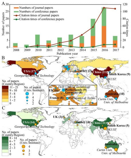 Figure 1 shows the trends and worldwide distributions of BIM-GIS integration studies during past ten years. The earliest studies appear in the early 21st century, where the earliest journal and conference articles appear in 2008 and some book chapters are published earlier (e.g., []). Progress of BIM-GIS integration studies is slow during the seven years of 2008–2014 with an average of six publications annually. Since 2015, the number of publications has significantly increased with 19, 27 and 8 articles published in 2015, 2016 and the first three quarters of 2017, respectively. The respective number of SCI/SSCI indexed publications are 7, 14 and 5. Meanwhile, the citation times of BIM-GIS integration studies especially the SCI/SSCI indexed publications have been continuously increasing.