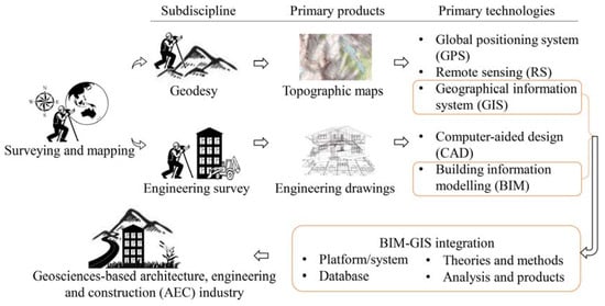 Analysis of the application evolution of BIM-GIS integration indicates that it is a trend to use integrated BIM-GIS to address diverse and complex problems in the AEC industry. Seen from the perspective of surveying and mapping histories, integrated BIM-GIS would have broader and deeper theories and methods for applications. Figure 2 shows the history of BIM-GIS integration from the perspective of surveying and mapping. GIS and BIM are the products of digitization of two subdisciplines of surveying and mapping, geodesy and engineering survey. On one hand, a central function of GIS is to analyze patterns and explore relationships of spatial data, which are primarily collected by geodesy methods [,,,,]. One of the primary products of field geodesy work is topographic maps with large spatial scales indicating terrain characteristics, infrastructure, buildings and land cover. After digitization of topographic maps, spatial data depicting natural attributes become data layers of GIS []. Further, due to the capability of spatial analysis, GIS becomes a science and system to analysis the spatial data and have deep and comprehensive understanding of natural process []. On the other hand, BIM is originally used as a platform for model visualization, data exchange and analysis of digitized engineering drawings of buildings or infrastructures []. With the wide applications from design to maintenance stages of construction management, BIM is changing the AEC industry []. BIM emerges as a system of creating, sharing, exchanging and managing building and urban information throughout the whole lifecycle among all stakeholders []. Thus, in theory, beyond the technology integration, i.e., platform or system integrations, BIM and GIS have great potential to be integrated from multiple aspects including integrations of database management, theories and methods, analysis and products, etc. For addressing urban problems, both BIM and GIS emphasize the utilization of ICTs and new technologies, and broadly cover the environmental problems. In addition to the ecological, energy and environmental issues solved by integrated BIM-GIS, BIM is also associated with the sustainability of buildings and urban infrastructures through a series of new methods such as lean production [,,,], carbon emission assessment [,,,,] and green buildings design []. Therefore, BIM and GIS can be integrated at various stages for the analysis in AEC industry and these integrations together can contribute to the theory and practice of smart sustainable city.