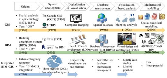 Compared with GIS, BIM is still relatively young and primarily serves as a collaborative platform, and more efforts are required to deeply understand and apply BIM in the AEC industry []. Integrated BIM-GIS is in the initial stage and it is rapidly developing in the last three years. In general, both GIS and BIM have experienced six primary evolution stages: origins, system development, digitalization and visualization, database management, visualization-based analysis and mathematical modelling (Figure 3).