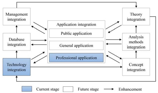 Current stage of BIM-GIS integration is at the technology integration and professional application stages. Technology integration is discussed in Section 3.1, and professional application means that most of the researchers and practitioners of integrated BIM-GIS are experts in the fields of either the AEC industry or geosciences. Few of them are general and public users. The stages of general application and public application is critical for the applications of technologies. GIS is utilized by experts, general users in institutes, companies and governments, and public users who can use simple codes even no code to develop their own tools and address their own problems []. For instance, Google Maps (https://www.google.com.au/maps) and OpenStreetMap (http://www.openstreetmap.org) enable public users to upload and download their own data and perform simple analysis such as distance measurement; and commercial companies such as Carto (https://carto.com/) and Mapbox (https://www.mapbox.com/) allow public users generate their own online interactive maps and perform spatial analysis use their own data and GIS methods. With the widespread mobile applications, millions of mobile applications are developed based on Google Maps (https://www.google.com.au/maps) [], Gaode Map (http://ditu.amap.com/), Baidu Map (http://map.baidu.com/), etc., for general and public users. Even though BIM is not fully used by public users, a great number of general users such as workers have applied BIM on their practical works in industries [,,]. Thus, research and practice of GIS and BIM indicate that integrated BIM-GIS can have wide and deep general and public applications in the future. Similar to the application integration, their respective concepts need to be integrated based on the combination of expert knowledge, innovatively integrated database tools and methods, and analysis methods and theories to address BIM-GIS specific smart sustainable city problems.