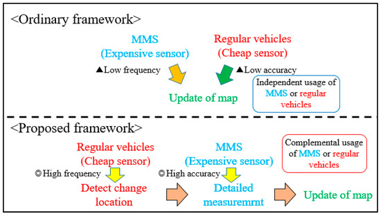 As discussed above, a method to update three-dimensional maps that satisfactorily addresses both frequency and accuracy requirements has not yet been established, and a framework that combines the best of both these approaches is needed. We propose a two-step approach (Figure 1). The changed locations are first detected using data from cheap sensors, and then detailed measurement is subsequently taken in those areas by using MMS. It will be possible to efficiently detect where changes in the road environment happen because data from regular vehicles can be frequently acquired, and the accuracy of the updated map would be consistent because MMS is used to acquire data for the map update. Thus, the proposed framework will contribute towards the sustainable updating of 3D road maps.