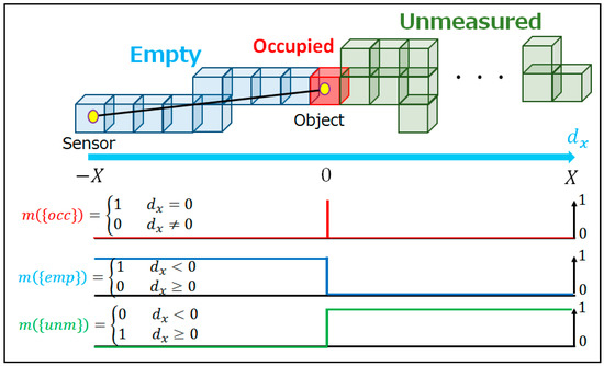 The probabilistic concept of the occupancy status is introduced in preparation for the sensor model. The model considers the measurement error and expresses the probability of each occupancy status in a voxel. Let the probabilistic expression of an occupancy status be called the “occupancy rate” in this research. The occupancy status of a voxel is either empty or occupied in real space. These possibilities can be represented as the universal set U = {emp, occ}, where {emp} and {occ} stand for empty and occupied, respectively. On the other hand, the measurement results are classified empty, occupied and unmeasured. Accordingly, the set of measurement results has to be considered as the power set of U, namely 2U = {, emp, occ, unm}, where {unm} stands for unmeasured. The belief mass m can then be defined as satisfying the following three mathematical conditions: