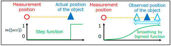 Based on the concept of occupancy rates, the sensor model can be introduced. Before explaining the mathematical expressions of the sensor model, it might be helpful to refer to the ideal situation. If there were no measurement errors involved, the occupancy rates would be expressed as in Figure 3. Each occupancy rate is explicitly classified without fuzziness, and it is easy to distinguish between empty, occupied, and unmeasured voxels. However, there are many errors to be considered in actual measurement. This research considers two types of errors. One is the horizontal direction error of LASER rays, and the other is the vertical direction error. Figure 4 depicts the error in the horizontal direction. In the case of an ideal sensor, the occupancy rate can be represented as a step function. However, a step function is not enough to express the errors in actual measurement. Therefore, a sigmoid function is introduced to represent fuzziness, as sigmoid functions are frequently used for smoothing step functions.