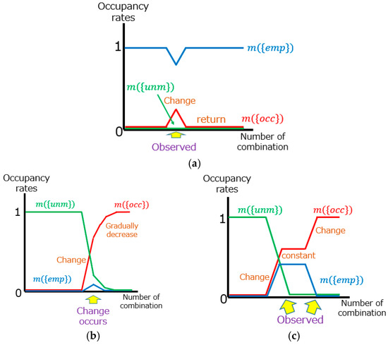 With regards to tentative changes, Table 5 shows that incorrect classifications occur when objects are added and appear. These areas are regarded as unmeasured, except for the parts with tentative changes. When m({occ}) increases, the occupancy rates do not return when m({unm}) = 1 is combined.