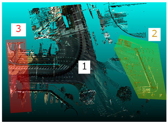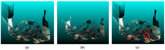As mentioned in Section 3.2.4, a correcting process is needed to improve the visibility so that we can easily and accurately recognize road environment changes. The main cause of misdetection is low density in the point cloud data. In particular, the point cloud tends to be sparse in the areas behind plants or fences, and far from the trajectory of vehicles. Due to this, sequential data in these areas have low densities and this leads to misclassifications. In this research, additional processing is applied and most of these misclassifications can be successfully removed. This process is manually executed in this experiment, but it is also be possible to implement this automatically. However, the extent to which this correcting process can be applied in other situations must be examined in future work. The removal conditions were decided ad hoc for this experiment, so it is necessary to establish more general processes and methods in the future. In addition, when similar processing is applied in the small-scale scenario, small objects are also removed because they are contained in only a few voxels. Further examination and research on reducing incorrect detections are needed in the future.