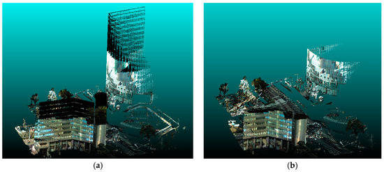 The registration results are shown in Figure 9. The cloud-to-cloud distance is used for evaluating the results. This distance is the nearest neighbor distance between two point clouds, and the base data is used as a reference. This experiment uses the standard function implemented in Cloud Compare [38] to measure the distance.