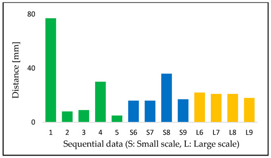 The results for sequential data (A) tended to be poorer than those for sequential data (B), especially sequential data 1 while data (A) is denser and covers a broad area. The reasons are not clear from the assessments based only on this experiment, but some of the poor results might occur because data (A) tend to fall into a local solution. Moreover, the relationship between the density and results of the registration process could be due to the evaluation method. This experiment uses the cloud-to-cloud distance, but there are other methods to calculate the distance between two-point clouds. Future work must explore other methods for evaluating registration results.