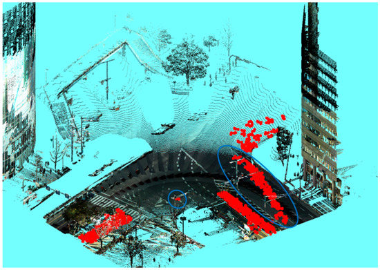 Three out of four road environment changes, called large-scale changes in this paper, are successfully detected. Two of these changes are expansions of the median strip, and the other is a change from street-side trees to a roadway. However, there are many excessive and incorrect detections as shown in Figure 11, and it is difficult to isolate only road environment changes. Figure 11 only visualizes the results for which the occupancy status has changed to occupied, but results for the change to empty also contain quite a few misdetections. Therefore, a correcting process is needed for dealing with incorrect detections. A large number of misclassified voxels have the following characteristics. The first is that they are distributed discretely. In other words, they have few neighboring voxels. Second, the incorrect classification is frequently observed in areas where the density is low, such as the area far from the MMS trajectory and behind plantings or fences. A voxel that satisfies the following conditions is removed in the correcting process: (i) the number of voxels neighboring the voxel is less than three; (ii) the area behind plantings or fences; (iii) the area is not within the roadway. After applying the correcting process, the results significantly improved (Figure 12). However, the area marked by the blue ellipse still contains incorrect detections.