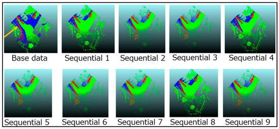 We prepared a total of ten instances of data for change detection in each scenario. The first data instance is the base data, and the others are sequential data. All instances of sequential data contain tentative changes, and just four of the nine data instances record road environment changes. Performances of sequential data, (A) and (B), are randomly set in the nine data instances called sequential data number because the data would be acquired randomly by different sensors in realistic situations. The number of data and observed changes are shown in Table 4. Moreover, it is assumed that there is prior knowledge on which data contain road environment changes. While this assumption might seem to be strong, it was difficult to carry out change detection in the pilot experiment without any prior knowledge. Accordingly, it is assumed to be a given that road environment changes are observed in sequential data numbers 6, 7, 8, and 9 in this experiment.