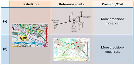 Under this new geospatial paradigm, the knowledge of the positional accuracy of a GDB is a critical aspect. Thus, a GDB with an insufficient level of positional accuracy for a particular purpose can be useful by integrating with other GDB with higher accuracy. Therefore, and regardless of this level of accuracy, it is necessary to know it. Positional accuracy has traditionally been evaluated by means of statistical methods based on measuring errors in points between the real world and the dataset (Figure 1a). From a statistical point of view, one of the most controversial aspects of these methods is the number of points that must be used to ensure, with a given level of confidence, that a GDB with an unacceptable quality level will not be acquired [7]. Thus, although recommendations always suggest at least 20 points [8,9], other studies [10] and institutions [11,12] suggest that this size (n = 20) seems to be very small, and larger sizes are proposed [13]. In this sense, the new capabilities offered by Global Navigation Satellite Systems (GNSS) in the last few decades have allowed a great improvement in the process of field data acquisition; however, their use still presents the inconvenience of having to use a limited number of points. This factor, combined with the very high cost of field surveying, represents the main weakness of the traditional points-based methods (Figure 1a).